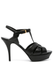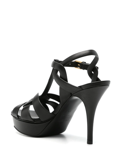 Saint Laurent's Tribute sandals quickly gained cult status after their debut on the runway in 2004, remaining one of the brand's most iconic styles. Crafted from leather, they boast the well-known interlocking straps to the front and are set on a 105mm stiletto heel and a balancing platform front.