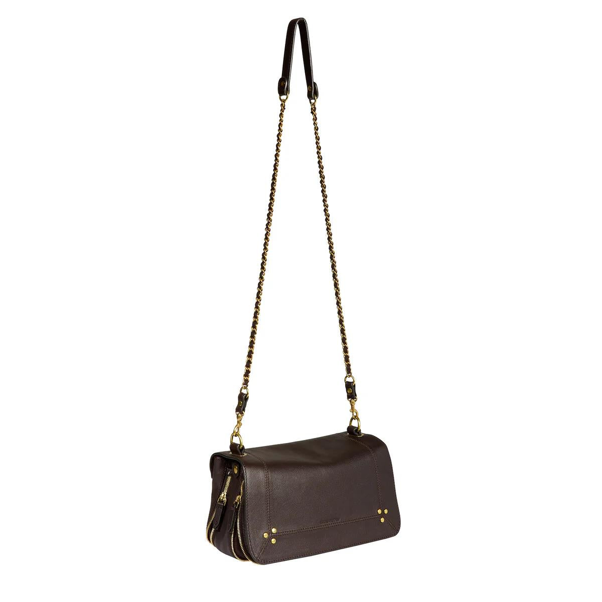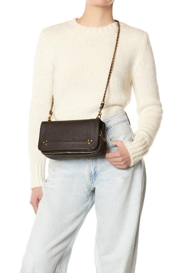 Tracolla rimovibile in pelle intrecciata e catena, regolabile in due lunghezze: 65 cm o 105 cm. Chiusura con patta magnetica in pelle. Borsa organizzata in tre scomparti. Volume regolabile tramite due soffietti con cerniera. Specchio rimovibile e portachiavi all'interno della borsa.