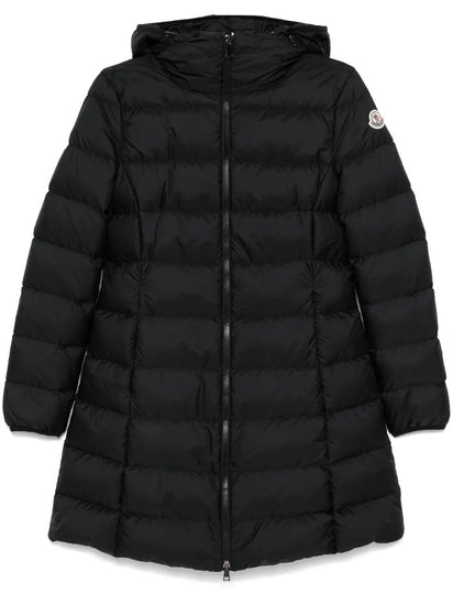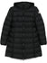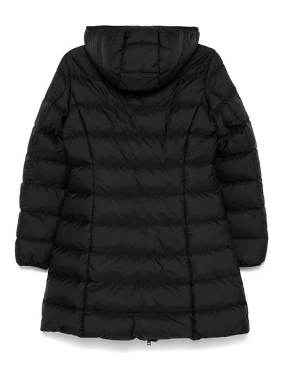 black feather down padded design quilted water-repellent front two-way zip fastening funnel neck slouchy hood long sleeves logo patch at the sleeve elasticated cuffs two side zip-fastening pockets full lining slight flare straight hem