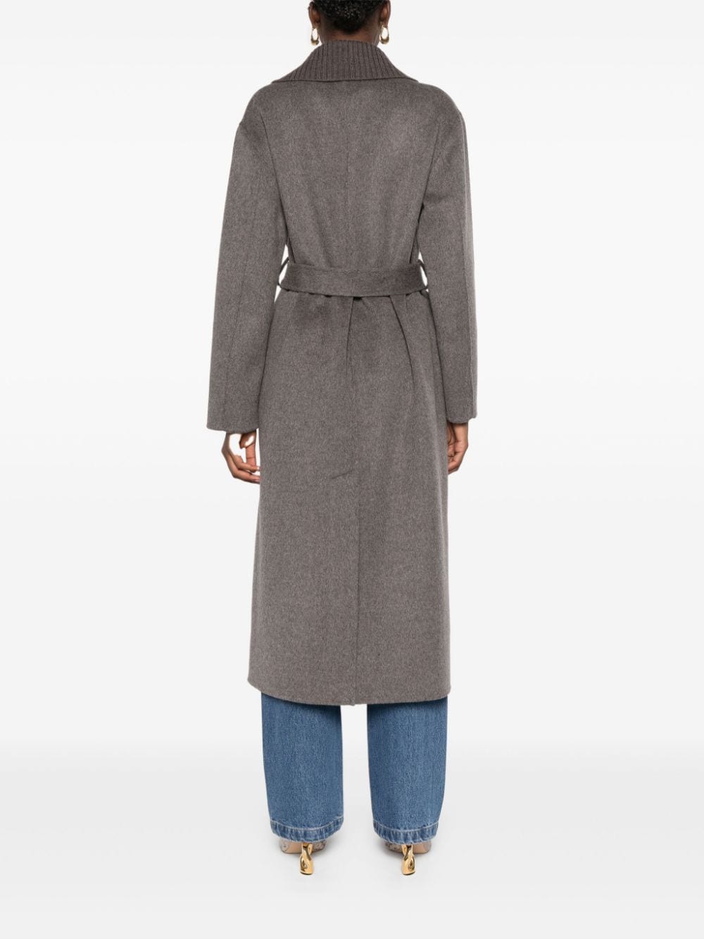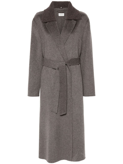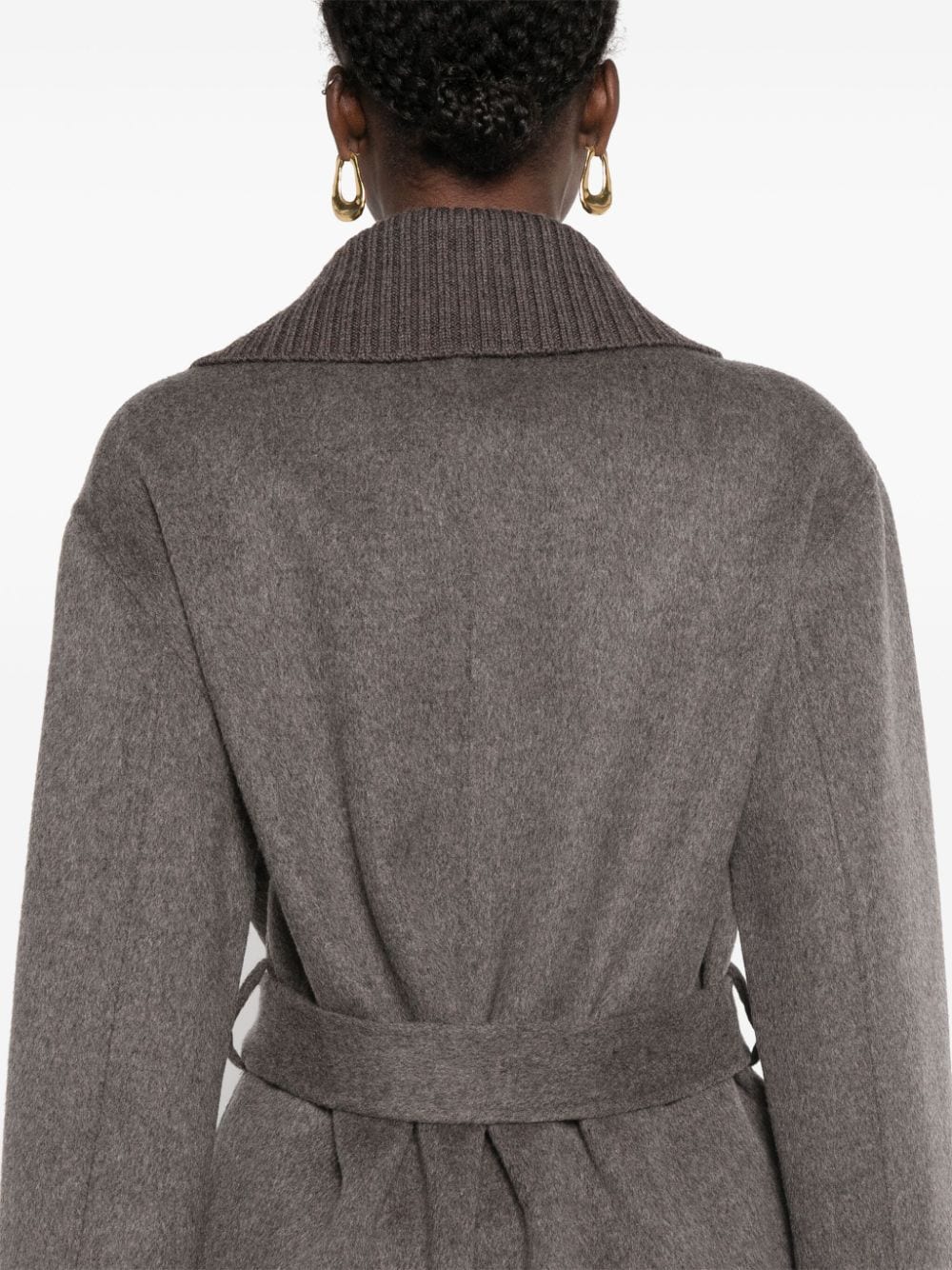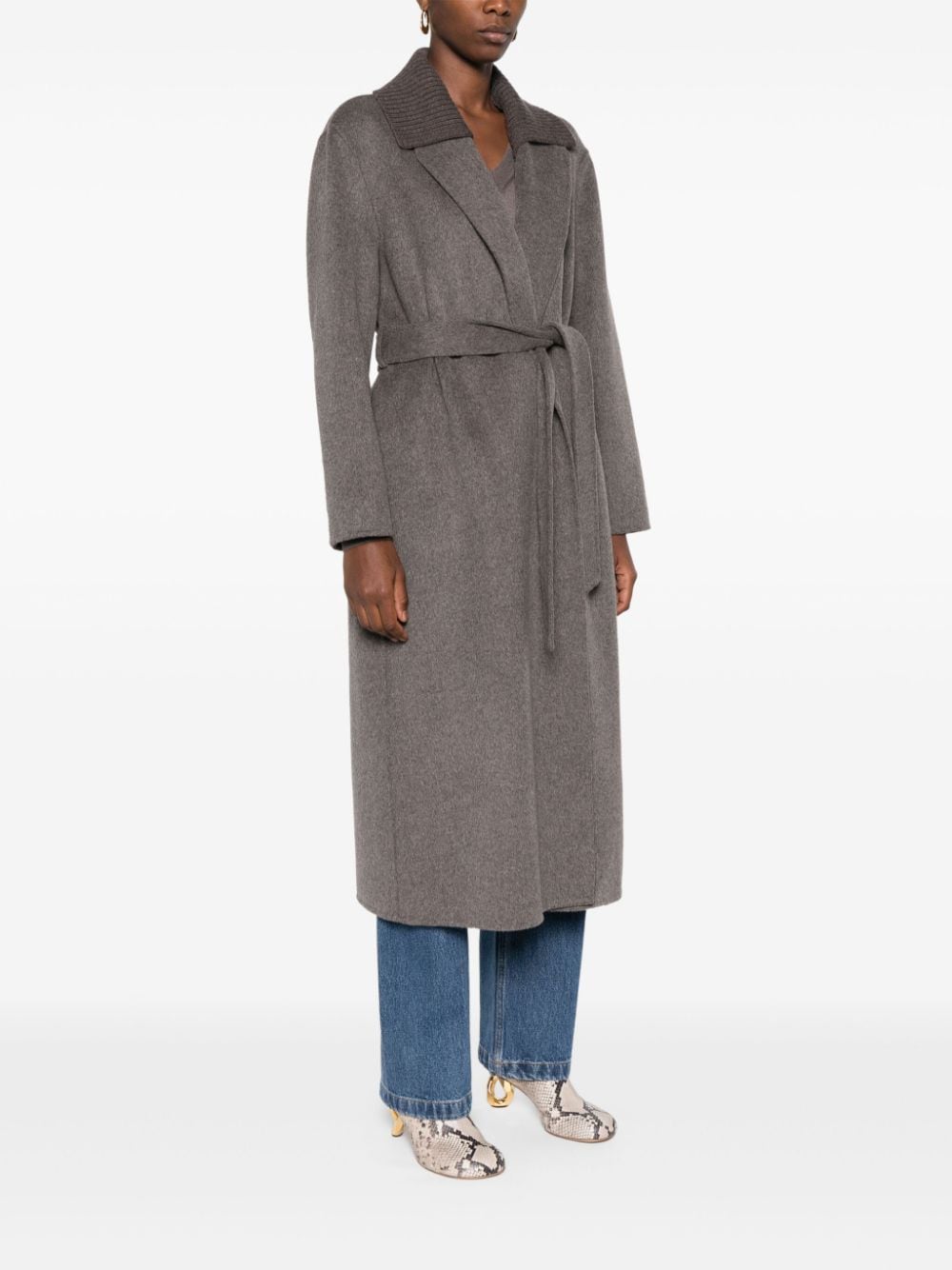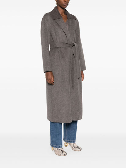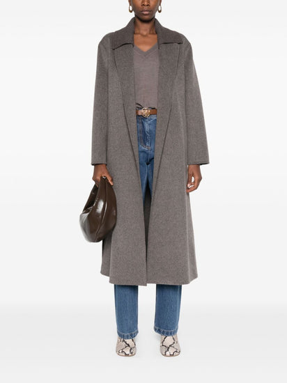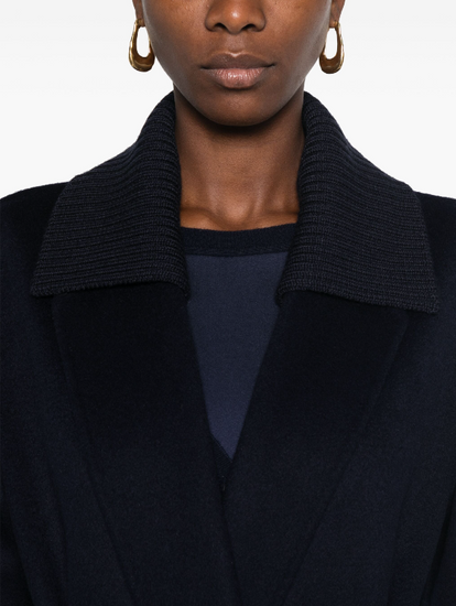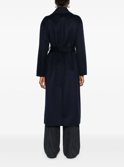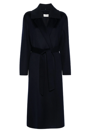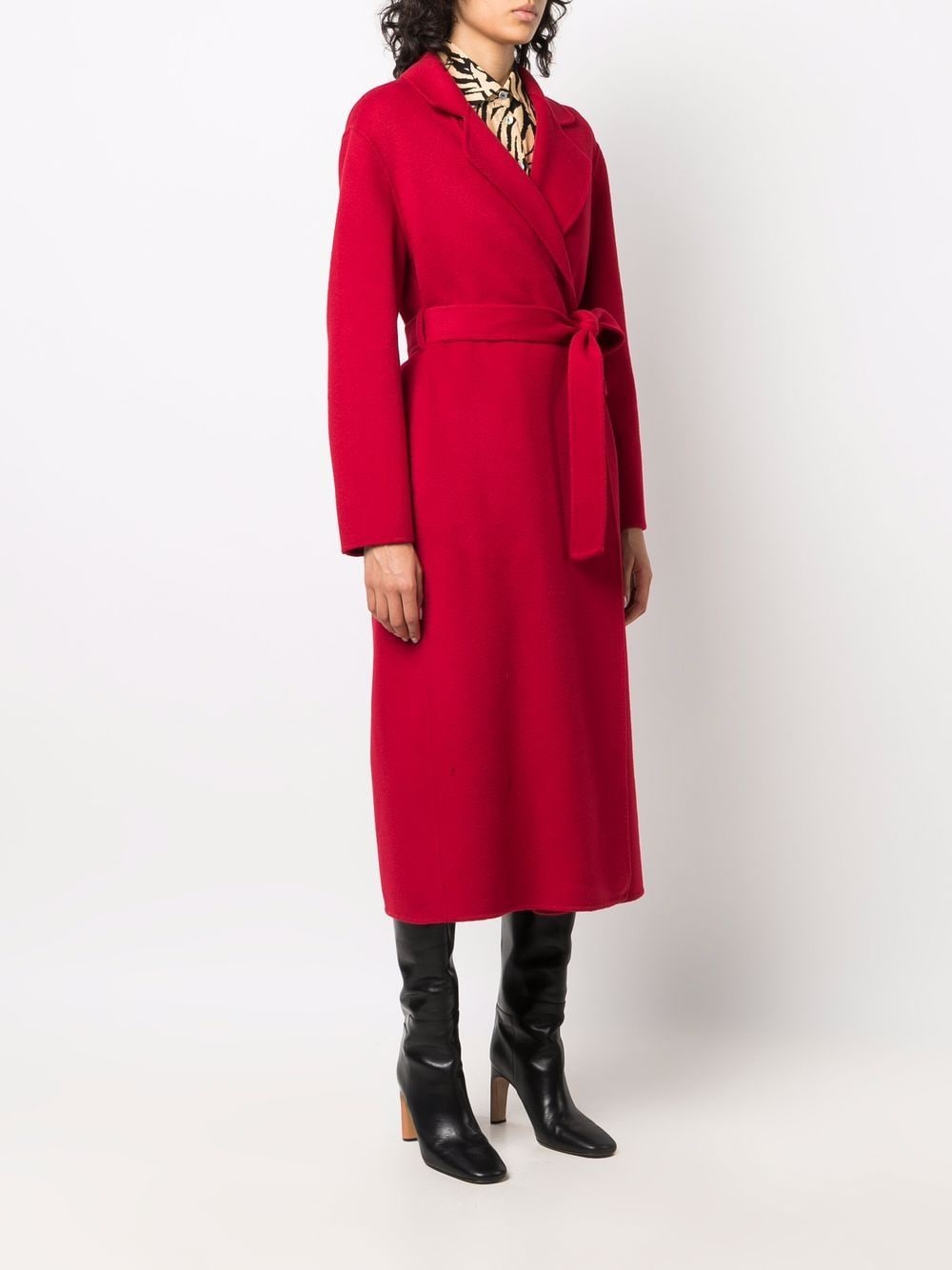 Deep red wool wide notch lapels belted waist belt loops long sleeves central rear vent.