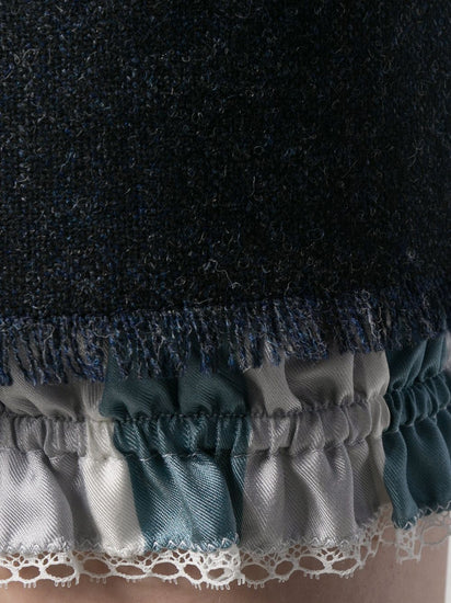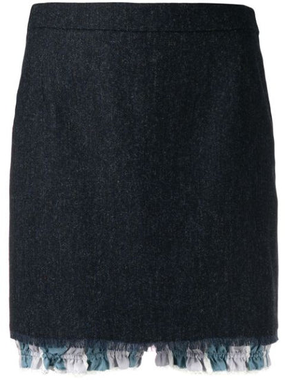 When you can't decide between shorts or skirts... Don't! Instead, opt for this dark blue silk, wool and cotton blend layered mini skirt from Thom Browne. It is that simple! Featuring a layered design, a high rise, a side zip fastening, a signature three stripe detail, fringed edges, a striped print and a short length.