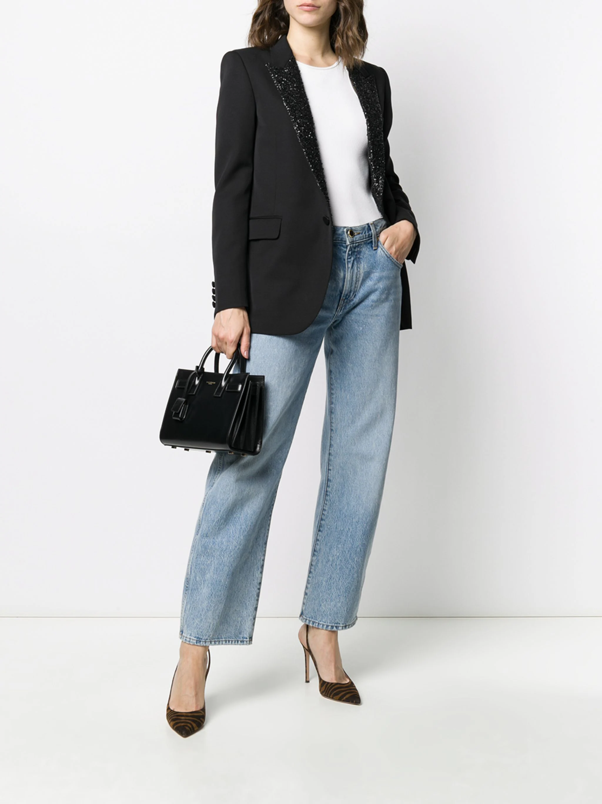 You are 'tote-ally' going to love this. Crafted from soft black calf leather, this Sac de Jour tote from Saint Laurent is sure to become your go-to bag to keep all your important essentials safe. Don't leave the house without it. Featuring round top handles, a detachable and adjustable shoulder strap, a front logo plaque and an internal slip pocket.